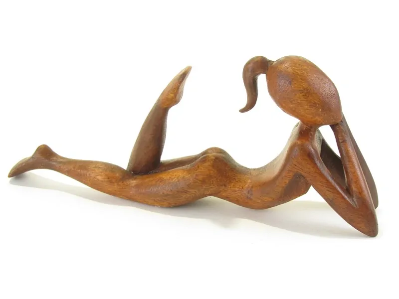 Pěkná dřevěná abstraktní soška ženy byla ručně vyřezána v Indonésii. Žena je zobrazena v ležící pozici na břiše, bez oděvu, s rukama pod jedním líčkem hlavy. Jedna noha ženy je ohnutá v koleni a zvednuta vzhůru. Na hlavě má žena vyřezaný cop. Dřevo suar má světle hnědou barvu.