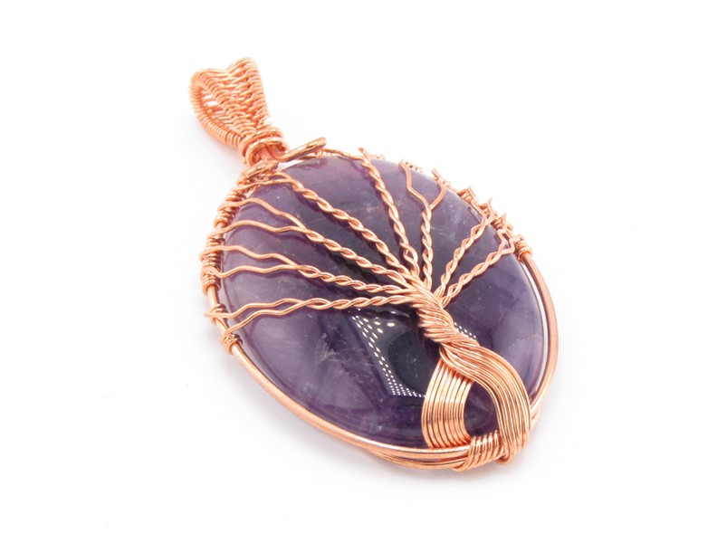 Překrásný oválný polodrahokam tmavě fialové barvy - ametyst je vsazen do měděného drátku. Kov lemuje obvod kamene a horní část kovového oválu je doplněna vypleteným očkem na protažení provázku. Celá přední strana ametystu je nádherně zdobená ručně vyplétaným stromem z měděných drátků. Ze zadní strany jsou rovněž měděné drátky, aby polodrahokam pevně držel v oválu.