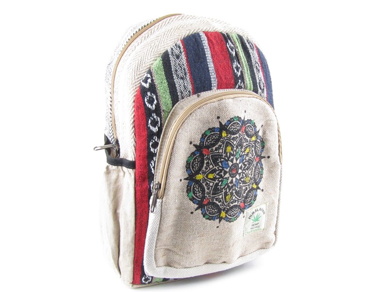 Krásný a praktický batoh byl vyroben v Nepálu z technického konopí, bavlny a viskózy. Vnitřní prostor batohu je polstrovaný a podšitý černou viskózou. Batoh zaujme nádherným originálním barevným potiskem, kterým je mandala. Potisk je umístěn na přední kapsu batohu, která má zapínání na zip. Přední kapsa je z konopí. Další kapsy má batoh po stranách, ty jsou staženy gumou. Horní strana batohu je opatřena rovněž zipem. Ve vnitřním prostoru je jeden prostor. V zadní části batohu jsou našity nastavovací popruhy. Zadní strana batohu a popruhy jsou z pruhované vícebarevné bavlny.