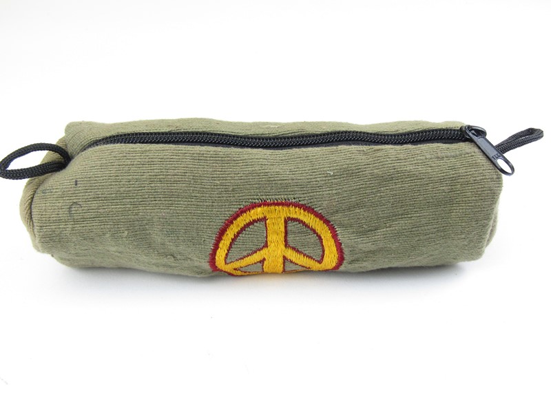 Bavlněné pouzdro bylo ušito v Nepálu. V horní části válcovitého tvaru pouzdra je všitý dlouhý černý zip. Zelená, pevně tkaná látka, je doplněná vyšitým symbolem znaku hippies. Viskózová nit výšivky je v barvě žluté a znak je obšitý červeně. Vnitřní díl je podšitý černou bavlnou.