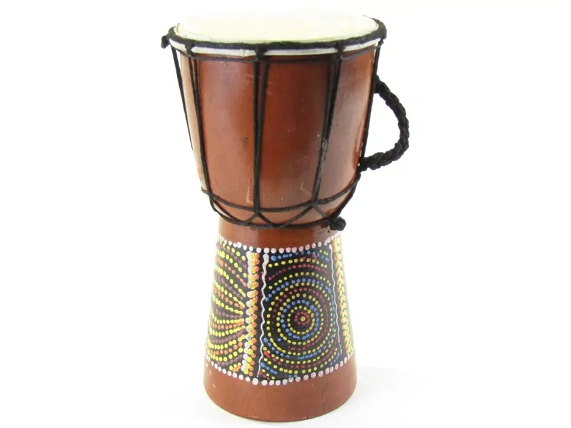 Pěkný buben byl vyroben v Indonésii z tropického tvrdého dřeva suar. Barvu má hnědou. Spodní díl bubnu je ručně malována tečkováním - stylem aboridžinců. Horní širší část bubnu doplňují černé bavlněné provazy, kterými je na obvod bubnu obmotána kozí kůže. Pomocí těchto provazů lze buben ladit. Kůže je napnutá na horní obvod bubnu.