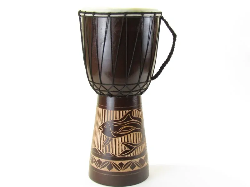Krásný buben byl vyroben v Indonésii z tropického tvrdého dřeva suar. Barvu má hnědou. Spodní díl bubnu je ručně vyřezávaná motivem ryby. Řezba je světlá. Horní širší část bubnu doplňují pevné černé bavlněné provazy, kterými je na obvod bubnu obmotána kozí kůže. Pomocí těchto provazů lze buben ladit. Na boční straně má buben upletené ucho z provazů na pohodlné přenášení. Kůže je napnutá na horní obvod bubnu.