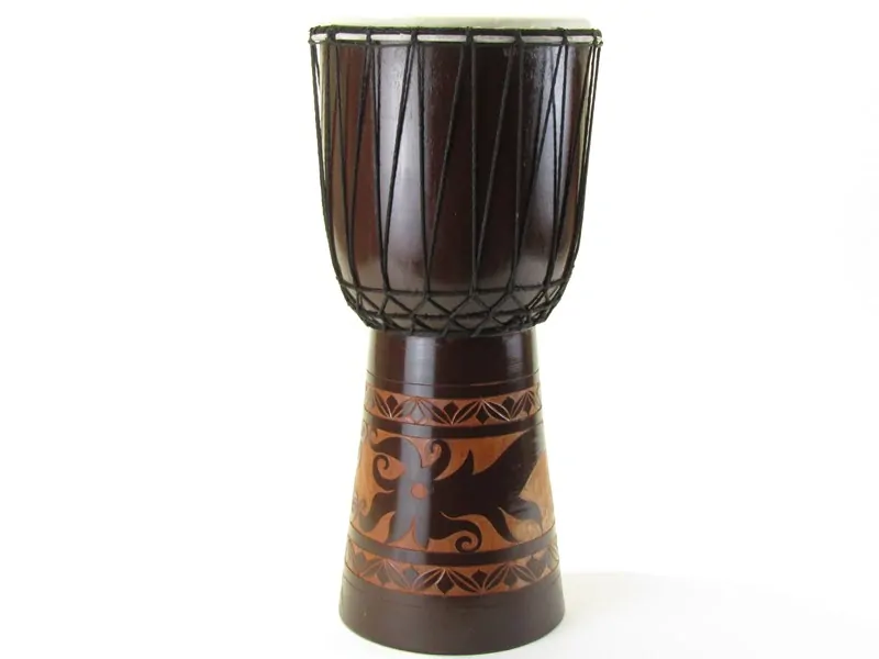 Krásný buben byl vyroben v Indonésii z tropického tvrdého dřeva suar. Barvu má hnědou. Spodní díl bubnu je ručně vyřezávaná motivem květiny. Řezba je na světlejším podkladě. Horní širší část bubnu doplňují pevné černé bavlněné provazy, kterými je na obvod bubnu obmotána kozí kůže. Pomocí těchto provazů lze buben ladit. Na boční straně má buben upletené ucho z provazů na pohodlné přenášení. Kůže je napnutá na horní obvod bubnu.