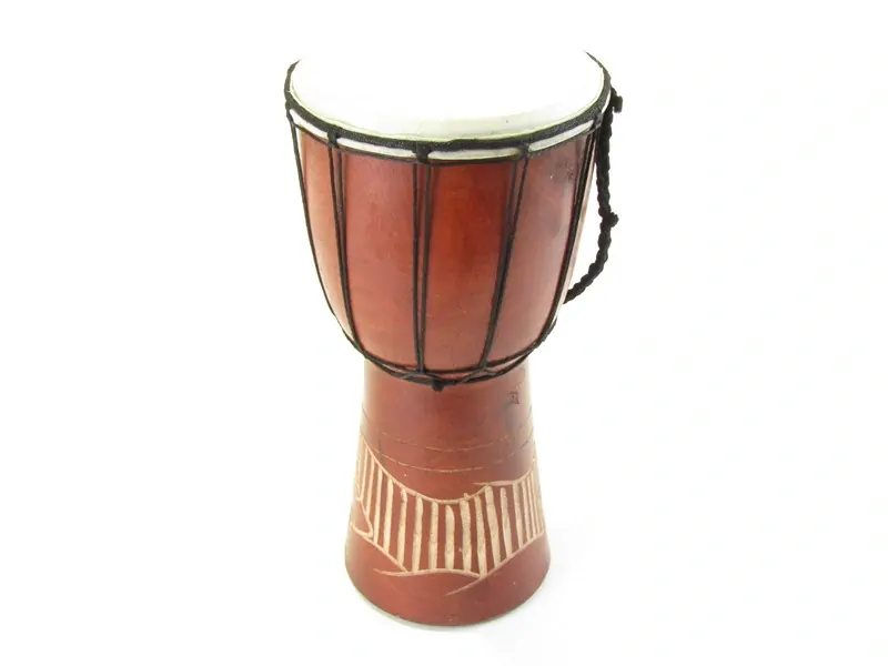 Pěkný buben byl vyroben v Indonésii z tropického tvrdého dřeva suar. Barvu má světle hnědou. Spodní díl bubnu je ručně vyřezávaná motivem ještěrky. Horní širší část bubnu doplňují černé bavlněné provazy, kterými je na obvod bubnu obmotána kozí kůže. Pomocí těchto provazů lze buben ladit. Kůže je napnutá na horní obvod bubnu.