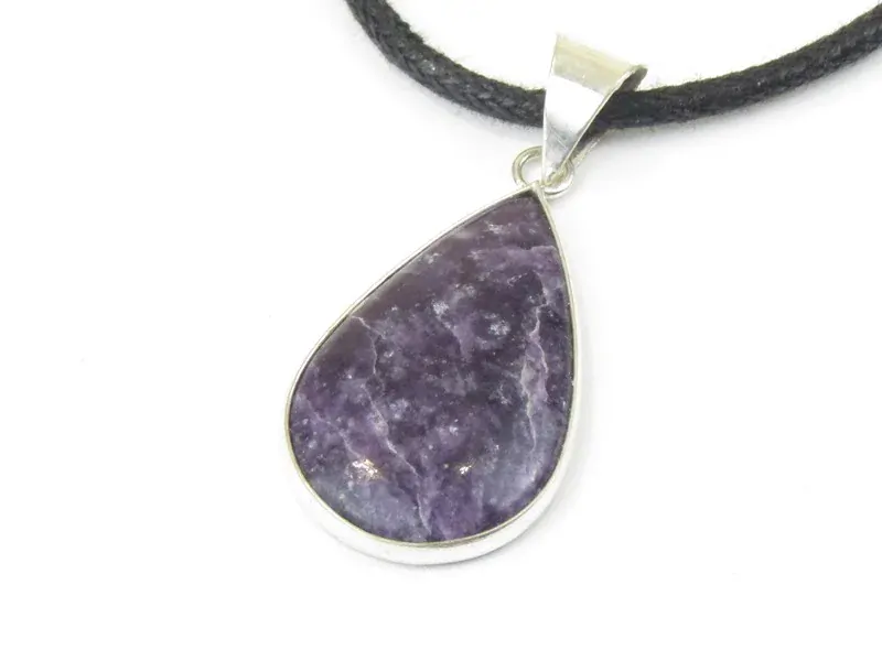Pěkný polodrahokam tvaru kapky, fialové barvy - čaroit je vsazen do bílého obecného kovu. Kov lemuje obvod kamene a horní část je doplněna očkem na protažení bavlnky. Bavlnka je součástí přívěšku. Bavlnka je kulatá, barvy černé a zavazuje se na uzlík.