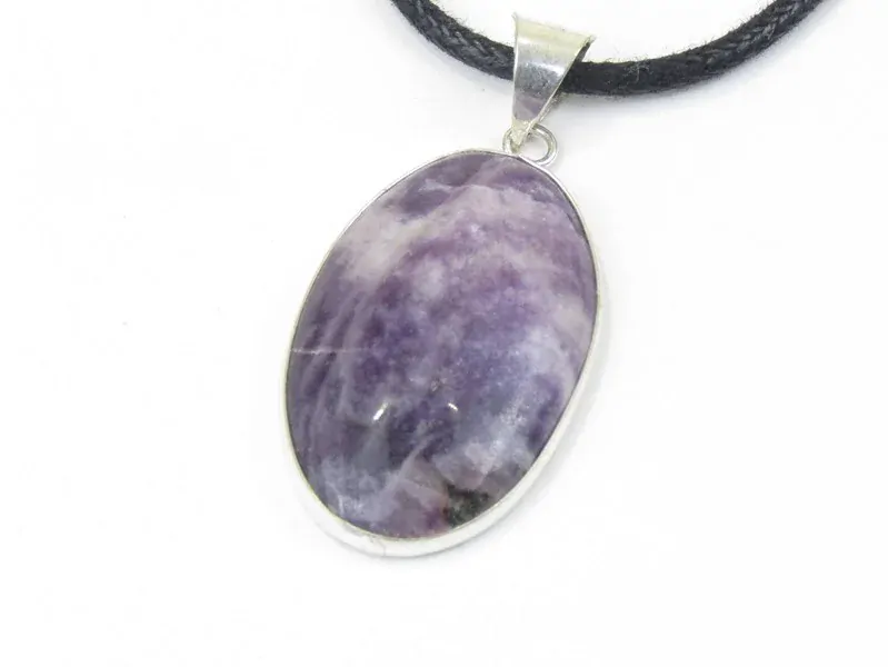 Pěkný oválný polodrahokam fialové barvy - čaroit je vsazen do bílého obecného kovu. Kov lemuje obvod kamene a horní část kovového oválu je doplněna očkem na protažení bavlnky. Bavlnka je součástí přívěšku. Bavlnka je kulatá, barvy černé a zavazuje se na uzlík.