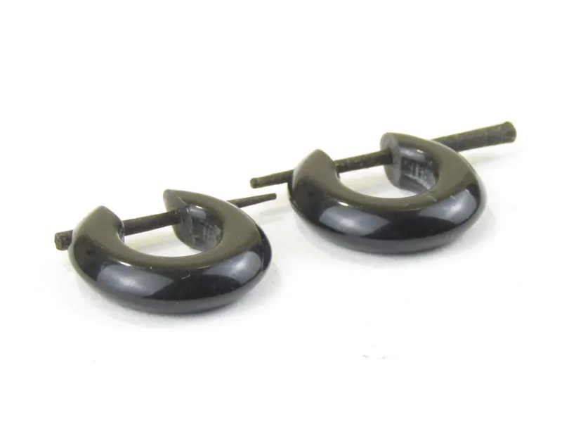 Náušnice (pár) byly ručně vyrobené v Indii z polymeru. Mají tvar neuzavřeného kruhu. Náušnice jsou vyrobené v černé barvě. Zapínaní je na dřevěnou tyčinku.