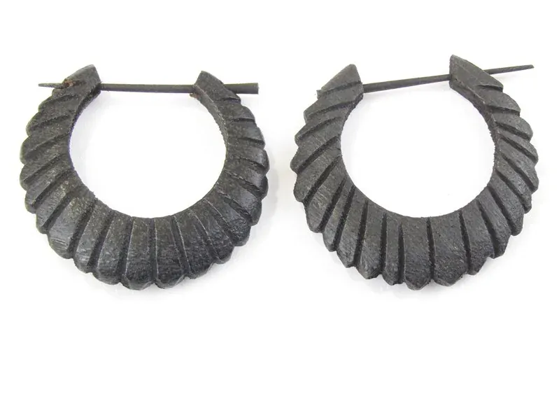 Náušnice (pár) byly ručně vyrobené v Indii ze dřeva. Mají kulatý tvar. Barva dřeva je černá. Zapínaní je na dřevěnou tyčinku.