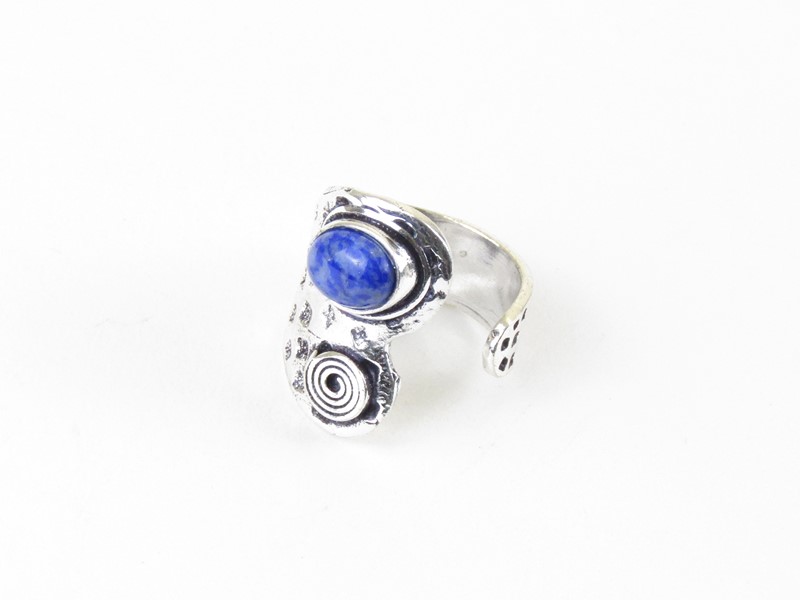 Krásný prstýnek byl vyroben v Indiiz obecného bílého kovu. Horní stranu prstýnku zdobí abstraktní tvar, kdy ve spodní straně je vsazen do lůžka oválný polodrahokam lapis lazuli a horní strana je doplněna kovovou spirálkou. Celá přední strana prstenu je tepaná tečkami. Spodní strana je bílá a hladká. Velikost prstenu lze upravit.