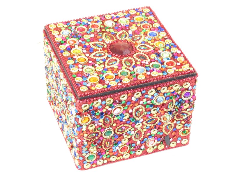 Orientální dřevěná krabička, s velice bohatým zdobením pomocí skleněných perliček, vytvářejících květinový motiv, byla ručně vyrobená v Indii. Dřevo krabičky je černé. Barva zdobení převládá červená a zlatá. Krabička má horní víko otevírací. Vnitřní prostor a spodní strana je černá, nezdobená. Tvar krabičky je obdélník.