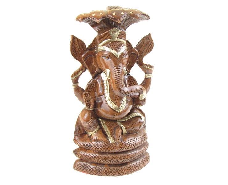 Dřevěná soška Ganéši je ručně vyrobena z mangového dřeva. Dřevo má barvu tmavě hnědou. Místy je dřevo dozdobeno barvou zlatou. Ganéš sedí na tělu stočené kobry, která se táhne pocelé zadní straně. Nad hlavou Ganéše má kobra rozvinutých pět hlav. Zadní strana sošky je rovněž krásně jemně zdobená. Zaujme svým jemným zpracováním. Dovezen je z Indie.