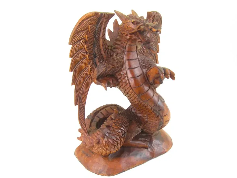Nádherná práce ručně vyřezávaného draka do nejjemnějších detailů. Vyroben byl v Indonésii. Velice jemná řezba zubů, šupinek i drápů. Drak je znázorněn ve stojící vzpřímené poloze s křídly. Vyřezán je ze dřeva suar v krásné hnědé barvě.
