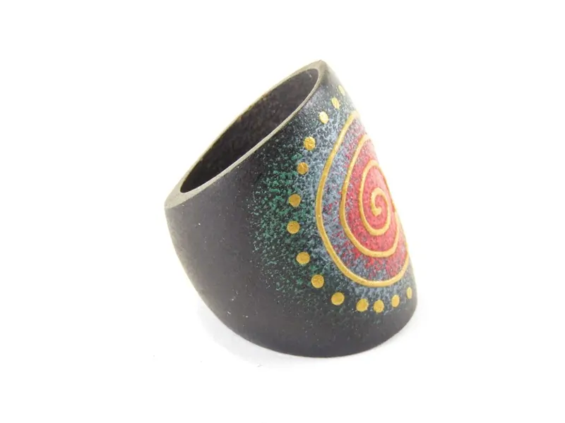 Prstýnek byl vyroben v Indonésii ze dřeva. Barva dřeva je černá. Horní stranu prstenu zdobí barevné ruční malování s motivem spirálky.
