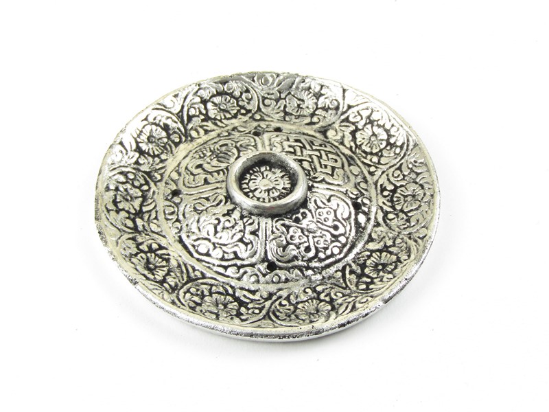 Praktický a nepostradatelný držák vonných tyčinek byl vyroben v Indii. Je vyroben z bílého lehkého obecného kovu. Tvar držáku je kulatý. Celá horní i spodní plocha je krásně zdobená tepáním se symboly nekonečného uzlua květů. Na horní straně je mírně vypouklý ještě jeden kruh, ve kterém je malý kruh, sloužící na vonný kužílek. Čtyři otvory pro bambusovou štěpku vonné tyčinky jsou po obvodu druhého vypouklého kruhu.