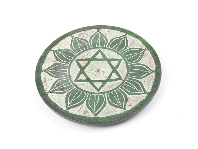 Praktický a nepostradatelný držák vonných tyčinek byl vyroben v Indii. Je ručně vyroben z kamene mastku. Podstavec držáku tvoří kruh, který má ve středu dírku pro štěpku vonné tyčinky. Kámen byl nabarven na zelenou barvu a ručně ozdoben řezbou ve tvaru lístků a pentaklu. Spodní strana je bez zdobení, zelená.