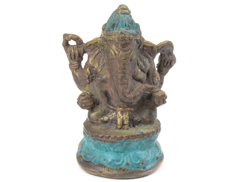 Krásná kovová soška Ganéši byla vyrobena v Indonésii. Má barvu hnědou, která je místy vyleštěna až do zlaté barvy. Hnědou doplňuje místy barva zelená. Hinduistický bůh Ganéš sedí na trůnu z lotosového květu. Vyobrazen je se čtyřmi pažemi. Soška je nádherně zdobená i ze zadní strany.