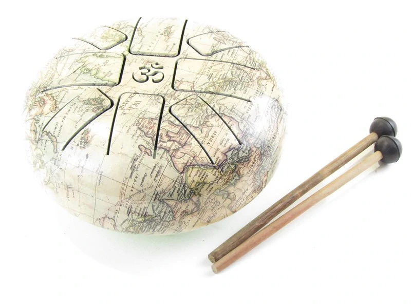 Kovový melodický bubínek byl vyrobený v Indii. Tvar má kulatý. Barva bubínku je hnědá s motivem mapy světa. Buben je ze spodní strany zelený. Spodní strana bubnu je opatřena třemi černými gumovými podložkami. Součástí bubnu jsou dvě dřevěné paličky s gumovou kuličkou na konci a praktický bavlněný obal.