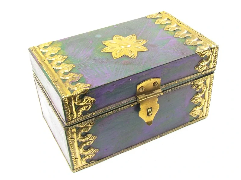 Pěkná dřevěná krabička, stylu vintage, byla vyrobena v Indii. Horní víko je otevírací. Víko je ze zadní strany přichyceno na kovové malé panty. Truhlička je v podkladové barvě fialové, kdy místy prosvítá barva zelená. Krásně je dozdobená kovovými tepanými plátky a mosazným zavíracím pantem. Spodní i vnitřní strana krabičky má barvu černou.