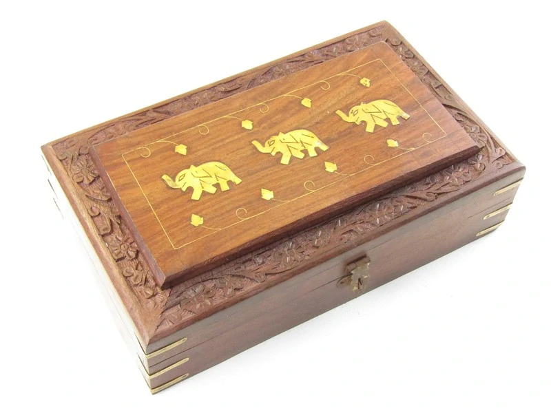 Pěkná dřevěná šperkovnice, v obdélníkovém tvaru, byla vyrobena v Indii. Horní víko je otevírací. Víko je z obou stran přichyceno na kovové malé panty. Celá horní strana krabičky je ručněvyřezaná motivem drobných květů a doplněná dalším dřevěným obdélníkem, zdobeným intarsií z mosazi v podobě tří slonů. Boční hrany zdobí kování. Spodní díl a vnitřek krabičky jsou hladké. Vnitřní prostor a víko krabičky je vyložené červeným sametem. Tropické dřevo má nádhernou hnědou barvu.
