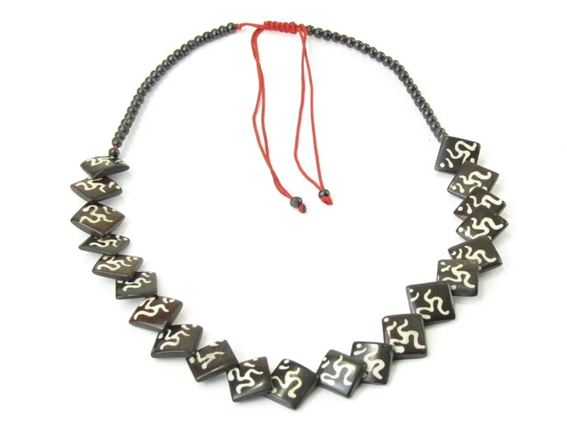 Náhrdelník z Indie je vyroben z pravé kosti v barvě černé. Kulaté malé korálky z kosti, v horní části náhrdelníku, jsou zakončené stahovacím uzlem z červené viskózy, díky kterému si můžete nastavit délku korálků, jakou potřebujete.Spodní část se skládá z 21 čtvercových dílků zdobených z přední strany symbolem Óm, světlou barvou. Všechny korálky jsou navlečené na pevné červené viskóze.