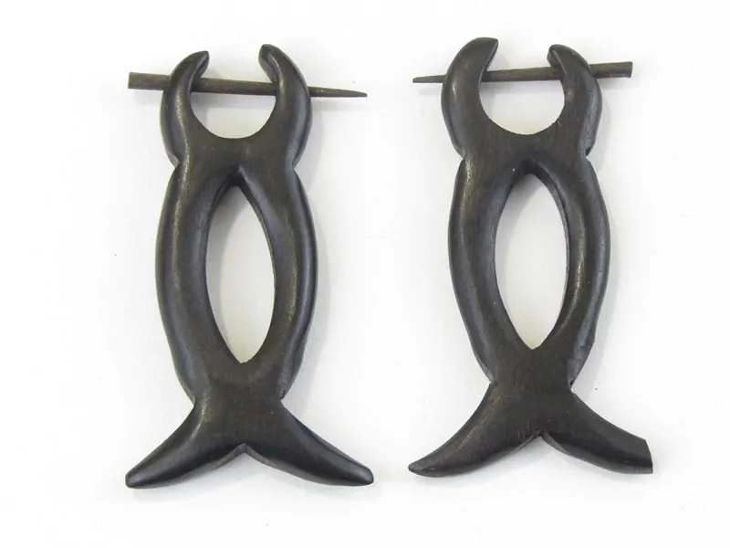 Náušnice (pár) byly ručně vyrobené v Indii ze dřeva. Mají delší, protáhlý moderní tvar. Barva dřeva je černá. Zapínaní je na dřevěnou tyčinku.