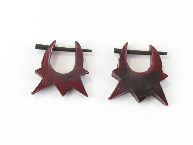 Náušnice (pár) byly ručně vyrobené v Indii z polymeru. Mají tvar otevřeného kruhu v horní části a spodní část je zdobená paprsky. Barva náušnic je červená. Zapínaní je na dřevěnou tyčinku.