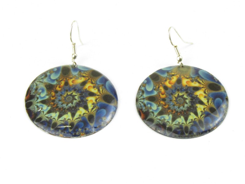 Kovové náušnice jsou vyrobeny z lehkého obecného kovu. Barevný potisk zobrazuje spirálku. Barvy jsou voleny v modrých, zelených, žlutých a hnědých tónech. Přes svoji velikost jsou velice lehké. Styl náušnic je visací.