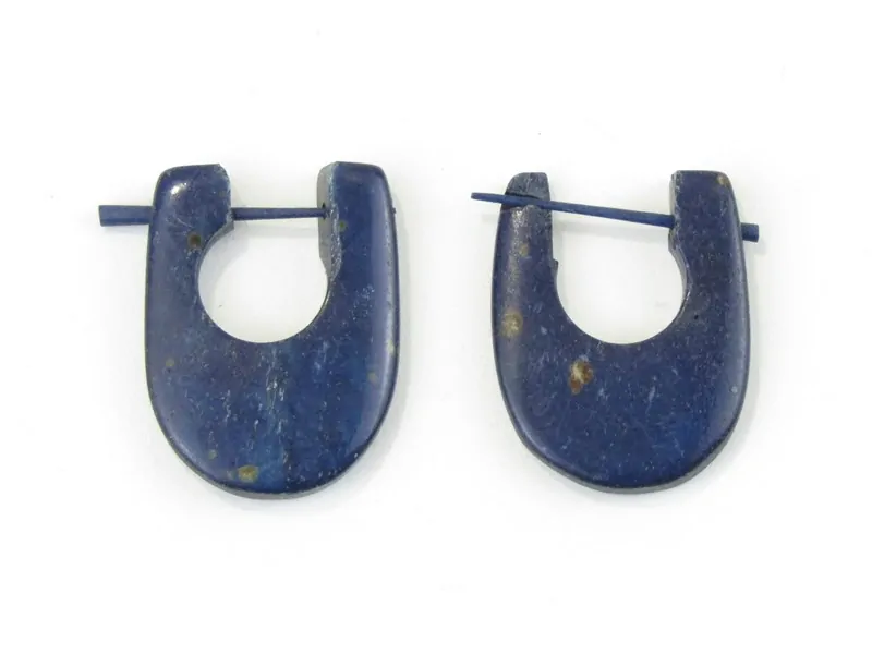Náušnice (pár) byly vyrobené v Indii z polymeru. Mají tvar půloválku. Barva náušnic je modrá, místy s hnědými tečkami. Zapínaní je na polymerovou tyčinku.