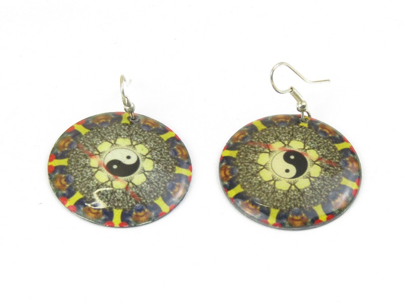 Kovové náušnice jsou vyrobeny z lehkého obecného kovu. Barevný potisk zobrazuje symbol jin-jang. Barvy jsou voleny v černých, bílých, hnědých, žlutých a červených tónech. Náušnice jsou příjemné na nošení a jsou lehké. Styl náušnic je visací.