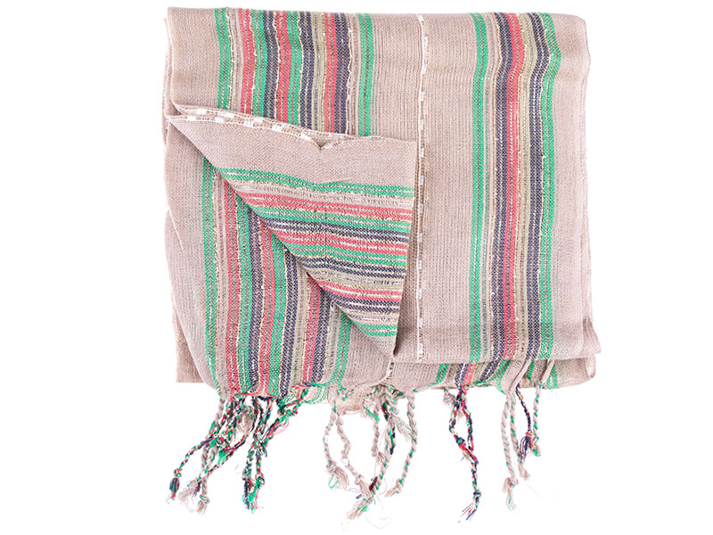 Velice příjemný šál byl vyroben v Indii z lehké bavlny. Celá obdélníková, světle hnědá, plocha šálu je zdobena barevnými pruhy. Barevné pruhy jsou ve svislém provedení. Místy je na pruzích zesílená nit v barvě světlé, což vytváří zajímavý jemný plastický efekt. Šál zvýrazňují zlaté vetkané nitky. Ve spodních částech šálu jsou pestré střapce.