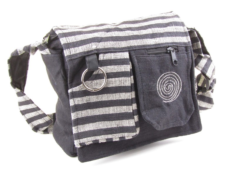 Krásná kabelka byla ušita v Nepálu z černé pevně tkané bavlny. Kabelka je na klopnu, která se zapíná na suchý zip. Na přední straně klopny jsou všity dvě kapsy, kdy jedna má zip a výšivku v bílé a černé barvě s motivem spirálky. Přední i zadní stranu látky doplňují bílé vetkané pruhy. Pod klopnou jsou všité dva dlouhé zip. Za horním zipem je větší úložný prostor na Vaše věci. Uvnitř kabelky je také zip s malou kapsičkou. Na boku kabelky je malá praktická kapsička na suchý zip.