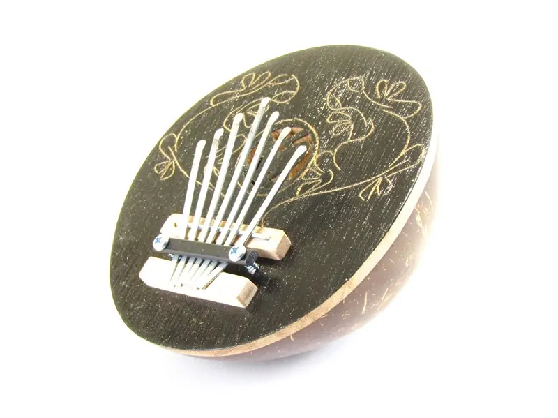 Karimba, kalimba, sansa,marimba či mbira je vyrobena z kokosového ořechu, na nějž je navrchu připevněna dřevěná kruhová deska s kulatým otvorem a 7 kovovými lamelami. Kokosový ořech je v krásné tmavě hnědé barvě doplněn tmavou dřevěnou horní části. Dřevěná deska je zdobená vyřezanými dvěma ještěrkama. Lamely jsou ke dřevu přišroubovány 2 křížovými šroubky, které nám povolením nebo dotažením umožní kalimbu doladit.