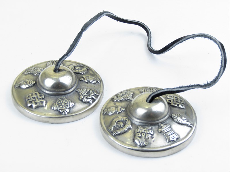 Kartálky - tibetské činelky-tingshak - byly vyrobeny v Nepálu ze slitiny kovů. Dva kusy jsou spojené černou kůží. Tyto kartálky jsou zdobené na horní straně symboly Nepálu. Barva je bílá - stříbrná.