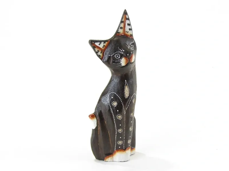 Dřevěná kočička je ručně vyřezaná z lehčího tropického dřeva. Vyrobena byla v Indonésii. Kočka má barvu tmavě hnědou. Celá přední strana kočky je ručně pomalována barvou bílou a světle hnědou. Zadní strana je nemalovaná, hnědá.
