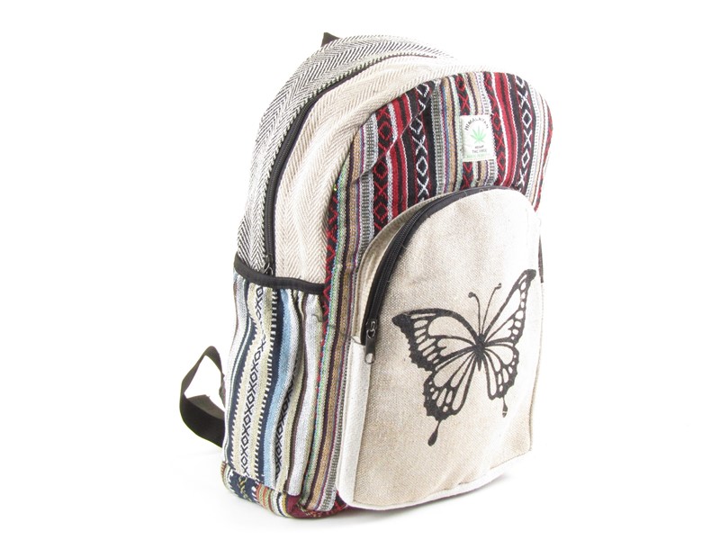 Krásný a praktický batoh byl vyroben v Nepálu z technického konopí, bavlny a viskózy. Vnitřní prostor batohu je polstrovaný a podšitý černou viskózou. Batoh zaujme nádherným originálním černým potiskem, kterým je motýl. Potisk je umístěn na přední konopnou kapsu batohu, která má zapínání na zip. Další kapsy má batoh po stranách, ty jsou staženy gumou. Horní strana batohu je opatřena rovněž zipem. Vnitřní prostor batohu je přepážkou rozdělen na dvě části. V zadní části batohu jsou našity nastavovací popruhy. Bavlněná látka celé plochy batohu je barevná, pruhovaná.