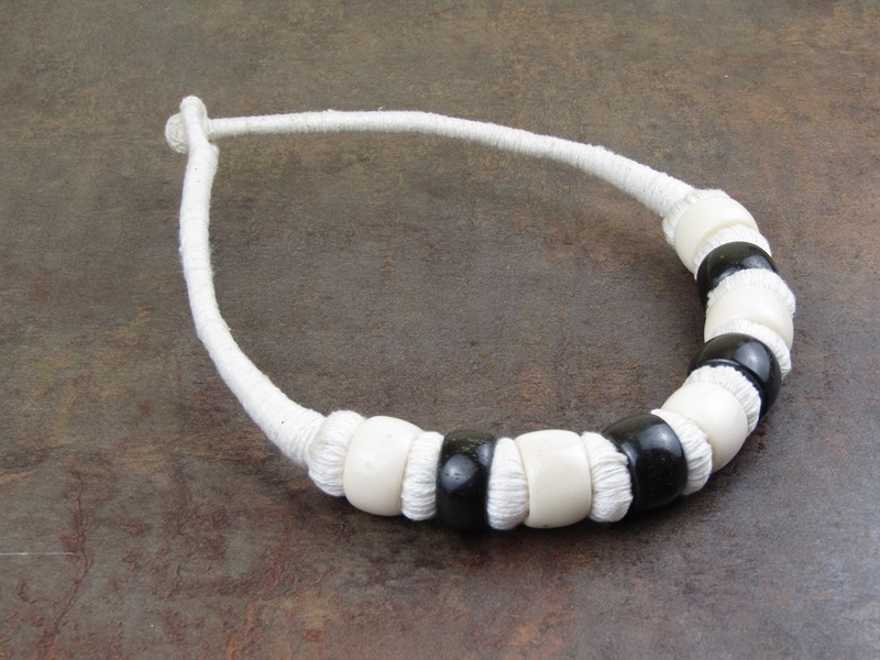 Náhrdelník z Indie je vyroben z bílé bavlny a kosti. Kostěné kulaté díly jsou v barvě přírodní kosti a v barvě černé. Díly korálků střídají kulaté díly z bílé bavlny. Zapínání je vyhotoveno z očka a kuličky z bílé bavlny.