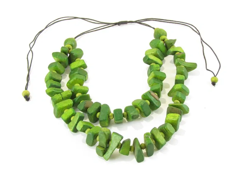 Krásný náhrdelník z Indonésie je vyroben ze dřevěných kousků v barvě zelené. Nepravidelné tvary ze dřeva v různých velikostech jsou navlečené ve dvou řadách nad sebou na černý bavlněný provázek. Dva černé provázky z každé strany jsou ukončené nastavovacím uzlíkem, kterým můžete upravovat délku korálků.