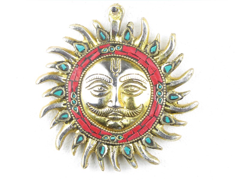 Krásné zpracování sluníčkaz Indie. Slunce je vyrobené z lehkého kovu barvy zlaté. Přední strana slunce je tepaná, kdy mírně vypouklý středový kruh slunce zdobí obličej s knírem. Okolo vypouklého kruhu je úzký dvouřadový pás z malých obdélníčků z drtě barvy červeného korálu. Po stranách kruhu jsou pěkné paprsky, které dozdobují kapky z drtě barvy zelené. V horní části je do jednoho paprsku zhotoven otvor na zavěšení sluníčka na stěnu. Zadní strana je hladká, bez zdobení.
