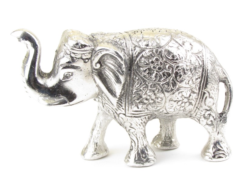 Nádherný kovový slon byl vyroben v Indii. Je vyroben z obecného bílého kovu. Celá plocha slona je krásně zdobená tepáním květinovým motivem. Slon stojí na všech čtyřech nohách. Socha byla vyrobena odlitím a je dutá. Chobot slona směřuje nahoru pro štěstí.