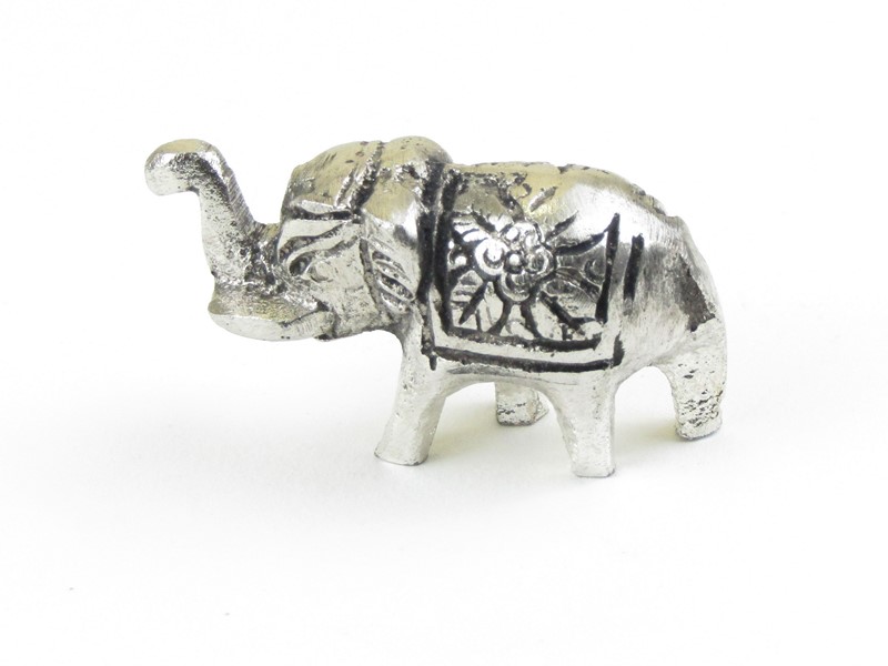 Nádherný kovový slon byl vyroben v Indii. Je vyroben z obecného bílého kovu. Celá plocha slona je krásně zdobená tepáním květinovým motivem. Slon stojí na všech čtyřech nohách. Socha byla vyrobena odlitím a je dutá. Chobot slona směřuje nahoru pro štěstí.