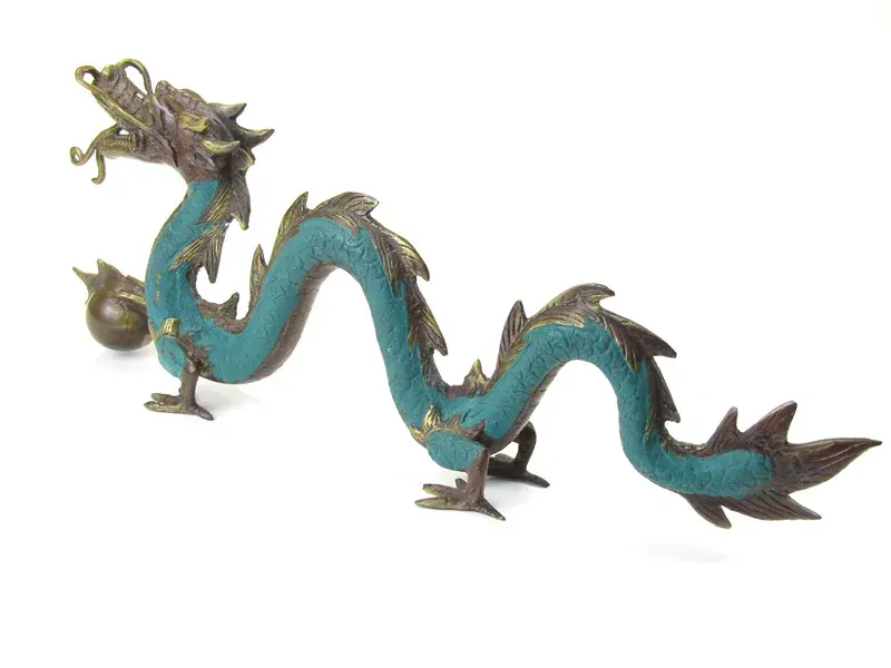 Nádherné zpracování kovového draka z mosazi a bronzu bylo vyrobené v Indonésii. Znázorněn je v lezoucí poloze, s protáhlým dlouhým tělem. V drápech drží ohnivou kouli barvy hnědé. Barva kovu je hnědá, místy vyleštěná do barvy zlaté, a tělo má drak ručně domalované barvou zelenou.