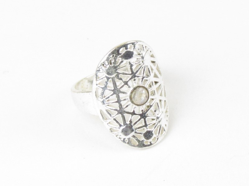 Krásný větší prstýnek byl vyroben v Indiiz obecného bílého kovu. Horní stranu prstýnku zdobí větší tvar oválu, do kterého je zobrazen motiv lotosového květu. Ve středu květu je vsazen malinký kulatý polodrahokam měsíční kámen. Spodní část je hladkánastavovací.