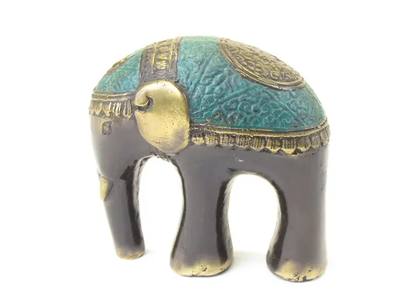 Originální moderní kovový slon byl vyroben v Indonésii. Je vyroben ze slitiny kovu, zvané bronze. Barva kovu je hnědá. Na hlavě a zádech je dobarven barvou zelenou. Ručně je krásně zdobený rytím. Chobot slona směřuje dolů pro zdraví.