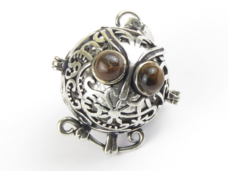 Kulatý přívěšek z obecného bílého kovu byl vyroben v Indii. Přívěšek se skládá ze dvou půlkruhů zdobených motivem sovy a prořezáváním. Oči sovy jsou dva polodrahokamy tygří oko. Dva kruhy proti sobě se dají otevřít a uvnitř je z bílého kovu kulička. Kulička při pohybu vydává pěkný zvonivý zvuk. V horní části je očko na řetízek nebo bavlnku. Ve spodním díle je větev, na které sova sedí.