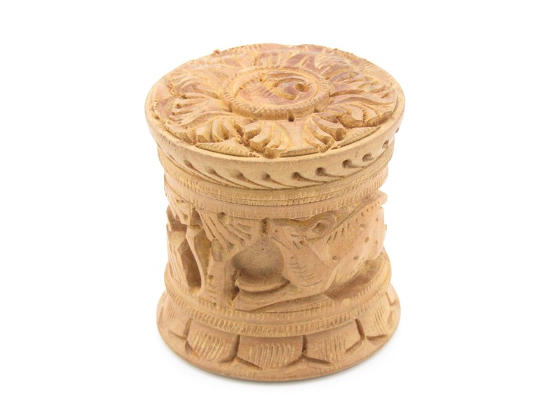 Pěkná malá dřevěná krabička, s horním šroubovacím víkem, byla ručně vyrobená v Indii. Víko i celá plocha krabičky je nádherně vyřezáváno motivem květu a zvířat. Dóza má válcovitý tvar. Barva krabičky je světlá. Vyrobená byla ze dřeva citrusovníků.