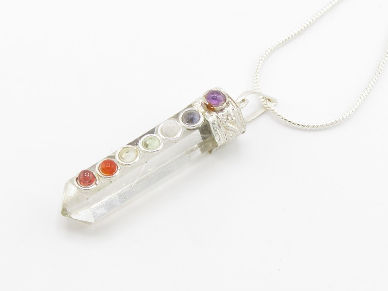 Krásný kus přírodního polodrahokamu křišťálu byl v Indii vyroben do tvaru kyvadla. Horní část kyvadla je vsazena do bílého obecného kovu s očkem na řetízek, kůži či bavlnu. Spodní díl je vybroušen do tvaru špice. Celý váleček se skládá z šesti plosek. Středem jedné z plosek kyvadla vede pás sedmi čočkovitých polodrahokamů v barvě čaker, které jsou vsazene do kulatého lůžka a připevněné k hlavnímu kamenu. Kyvadlo můžete použít pro práci nebo jako přívěšek.