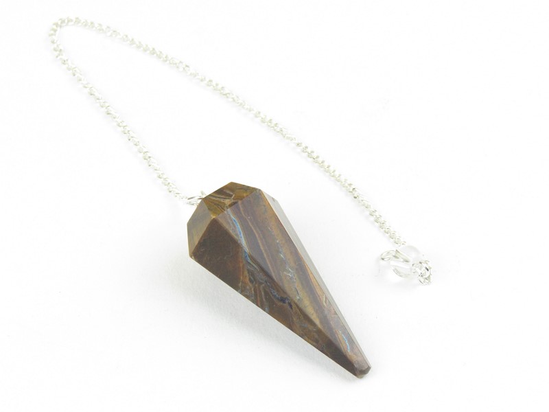 Krásný kus přírodního polodrahokamu tygří oko byl v Indii zpracován do tvaru kyvadla. Kyvadlo je vybroušené do plosek a končí špicí. Horní část kyvadla je doplněna očkem z obecného bílého kovu, na které je nasazen řetízek. Řetízek ukončuje korálek z křišťálu.
