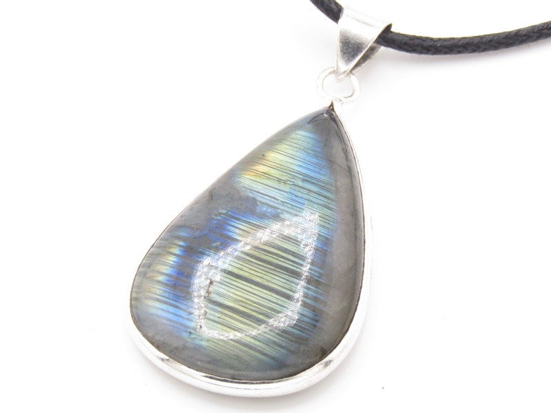 Překrásný polodrahokam labradorit, ve tvaru kapky, je vsazen do bílého obecného kovu. Kov lemuje obvod kamene a horní část kovového oválu je doplněna očkem na protažení bavlnky. Bavlnka je součástí přívěšku. Bavlnka je kulatá, barvy černé a zavazuje se na uzlík.