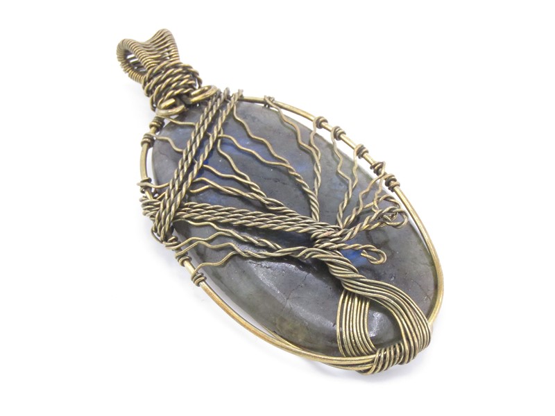 Překrásný oválný polodrahokam labradorit je vsazen do drátku ze žlutého obecného kovu. Kov lemuje obvod kamene a horní část kovového oválu je doplněna vypleteným očkem na protažení provázku. Celá přední strana polodrahokamu je nádherně zdobená ručně vyplétaným stromem ze žlutých drátků. Ze zadní strany jsou rovněž drátky, aby polodrahokam pevně držel v oválu.