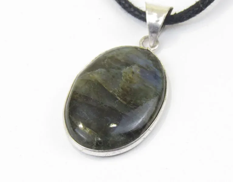 Pěkný polodrahokam labradorit, ve tvaru oválku, je vsazen do bílého obecného kovu. Kov lemuje obvod kamene a horní část kovového oválu je doplněna očkem na protažení bavlnky. Bavlnka je součástí přívěšku. Bavlnka je kulatá, barvy černé a zavazuje se na uzlík.